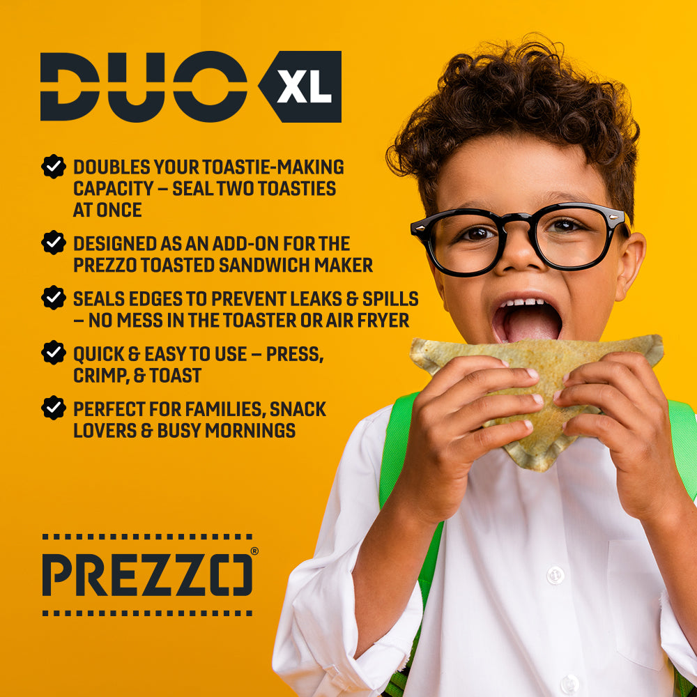 Make healthy heated snacks in minutes with PREZZO! No need for clunky, greasy electric toastie makers! Simply crimp together your fillings of choice, remove the sandwich parcel from PREZZO, pop in the toaster, oven, grill or air fryer and BOOM…Enjoy your newly created snack with minimal effort and minimal mess!